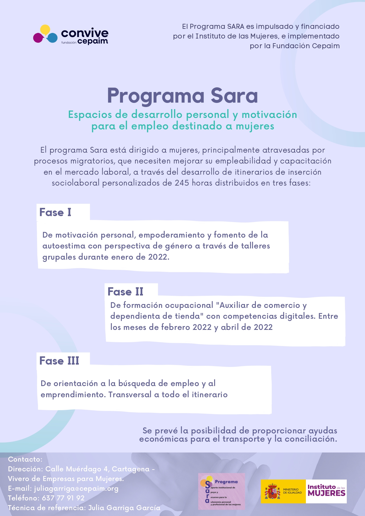 El Programa SARA es un programa de inclusión sociolaboral dirigido a la motivación y acompañamiento de colectivos de mujeres en situación de especial vulnerabilidad, como son mujeres migrantes, mujeres de etnia gitana, mujeres jóvenes y mujeres mayores de 45 años en situación exclusión, desarrollado gracias a la colaboración de la Fundación CEPAIM, Cruz Roja Española, la Fundación Secretariado Gitano y la Federación Española de Universidades Populares.