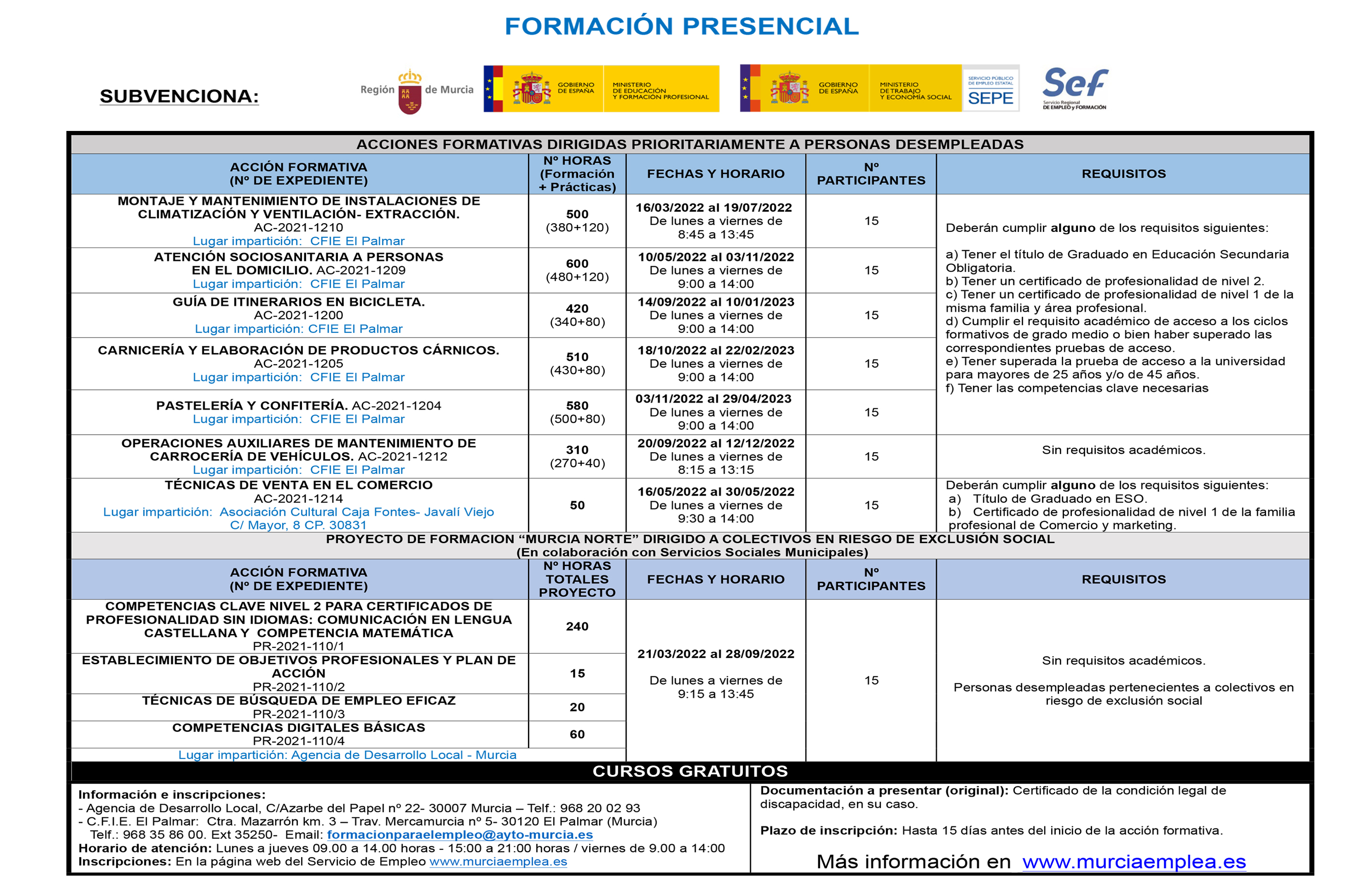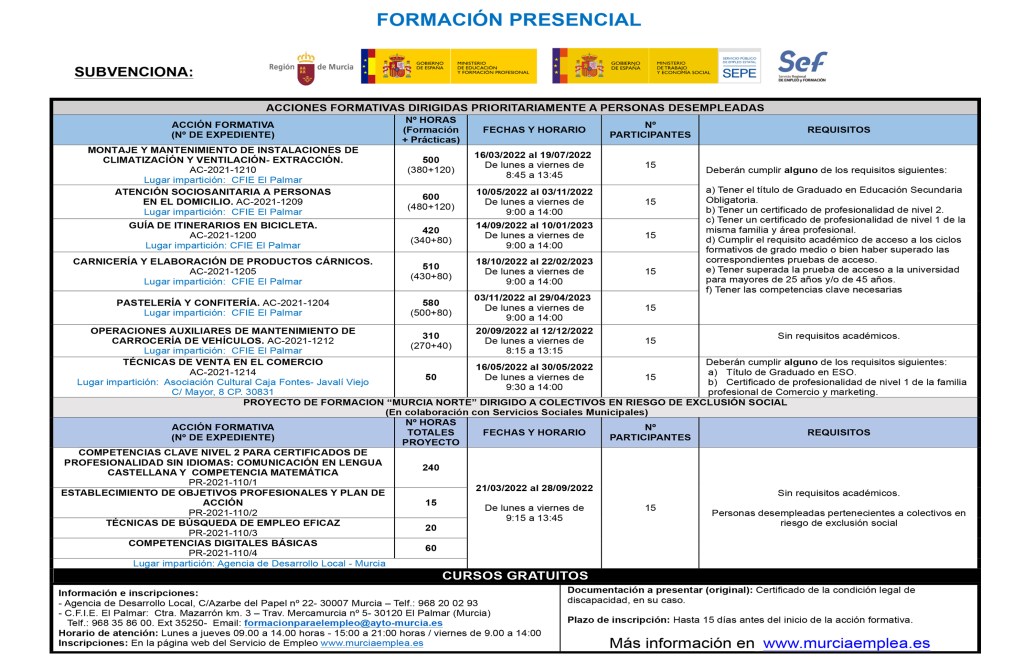 Para solicitar información de los cursos de modalidades presenciales, puedes llamar al 968 20 02 93 o mandar un mail a formacionparaelempleo@ayto-murcia.es