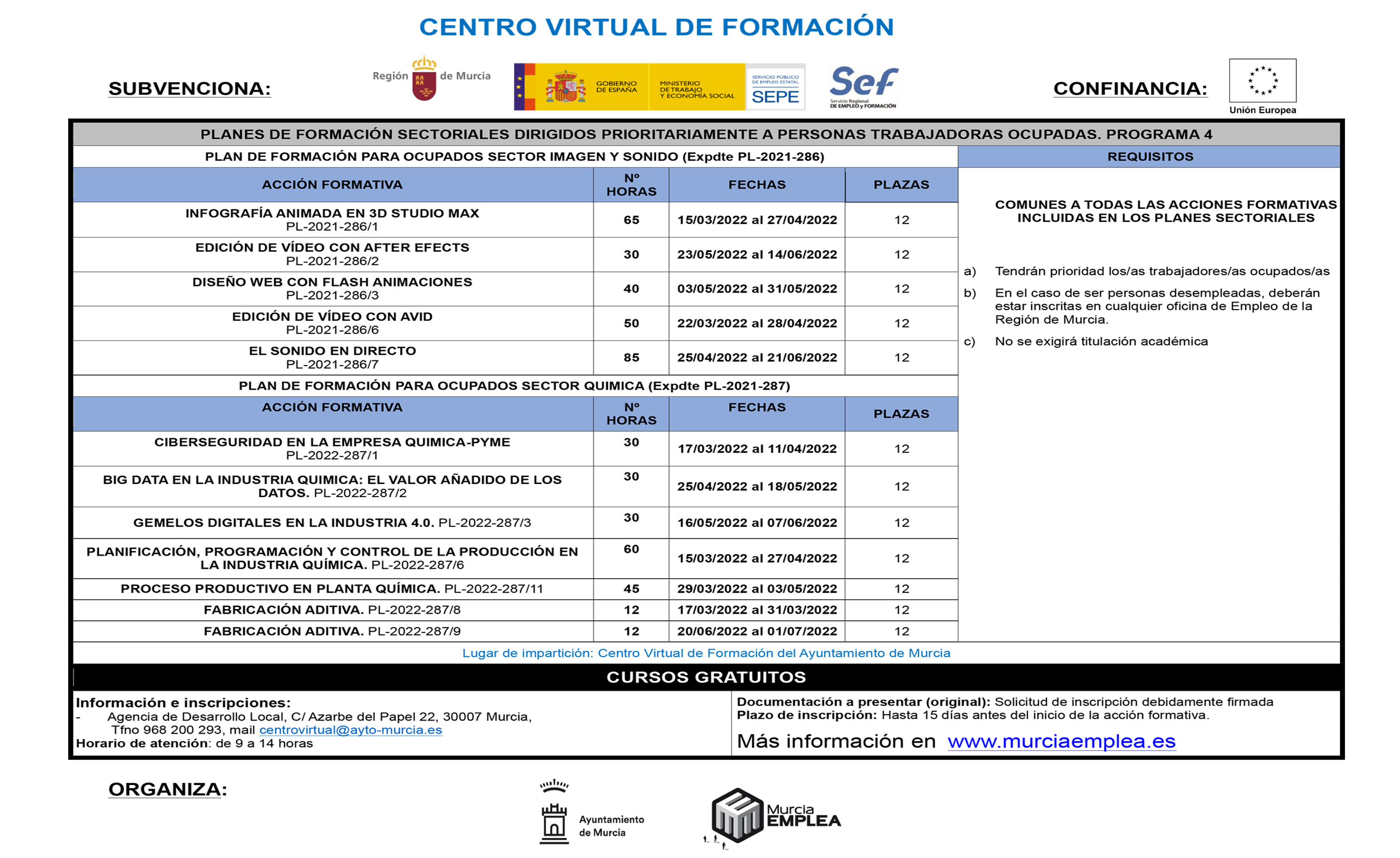 Para solicitar información de los cursos de modalidades a distancia, puedes llamar al 968 20 02 93 o mandar un mail a centrovirtual@ayto-murcia.es