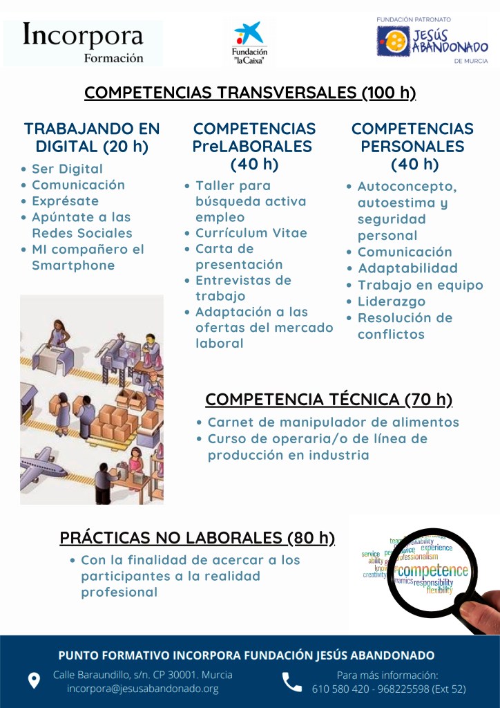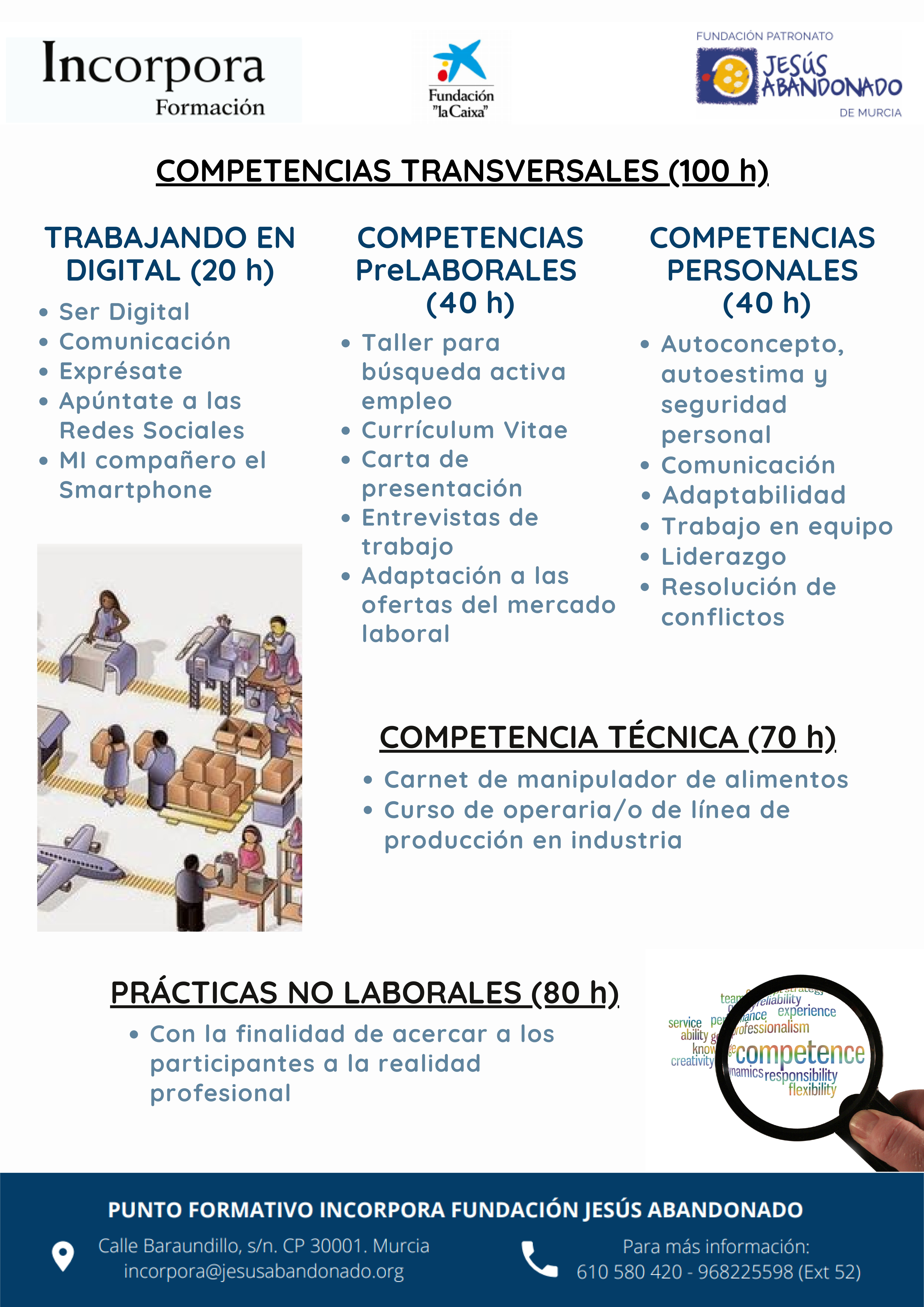 Para más información, llama al 968 225 598 (ext 52) o al 610 580 420. También puedes mandar un correo a incorpora@jesusabandonado.org.