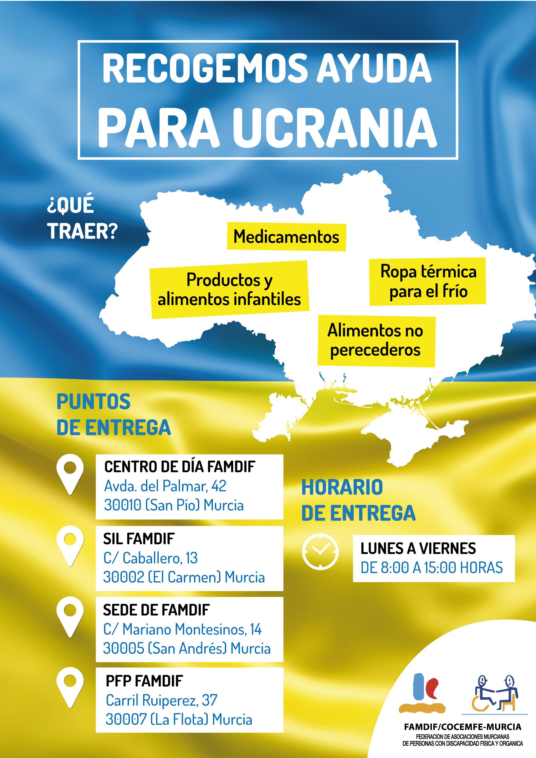 Desde FAMDIF/COCEMFE-MURCIA y el Servicio de Integración Laboral queremos aportar nuestro granito de arena para intentar mejorar en lo posible la injusta situación que está viviendo el pueblo ucraniano.