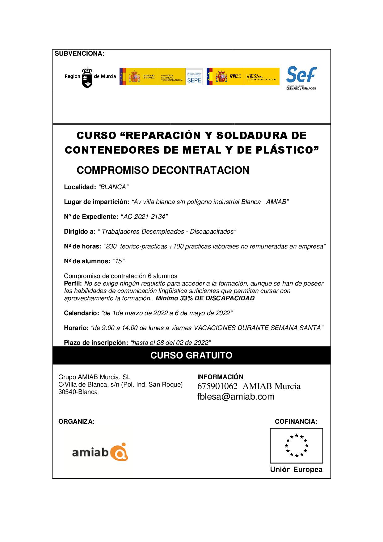 Sin categoría Curso de «Reparación y Soldadura de Contenedores de Metal y de Plástico» con compromiso de contratación 21 marzo, 2022 SIL Región de Murcia Descubre más desde SERVICIO DE INTEGRACIÓN LABORAL Suscríbete y recibe las últimas entradas en tu correo electrónico. Escribe tu correo electrónico… Suscribirse Comparte: Haz clic para compartir en X (Se abre en una ventana nueva) X Haz clic para compartir en Facebook (Se abre en una ventana nueva) Facebook Me gusta Cargando... Relacionado Publicado por SIL Región de Murcia Ver todas las entradas de SIL Región de Murcia Comparte: Haz clic para compartir en X (Se abre en una ventana nueva) X Haz clic para compartir en Facebook (Se abre en una ventana nueva) Facebook Me gusta Cargando...