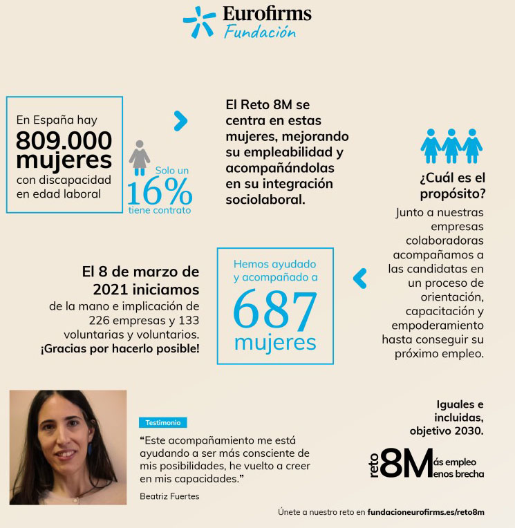 Se trata de un taller online que realiza la Fundación Eurofirms con mujeres dispongan de certificado de discapacidad donde se comenta la situación que tienen, su experiencia, las ofertas de trabajo, empoderamiento femenino, etc.