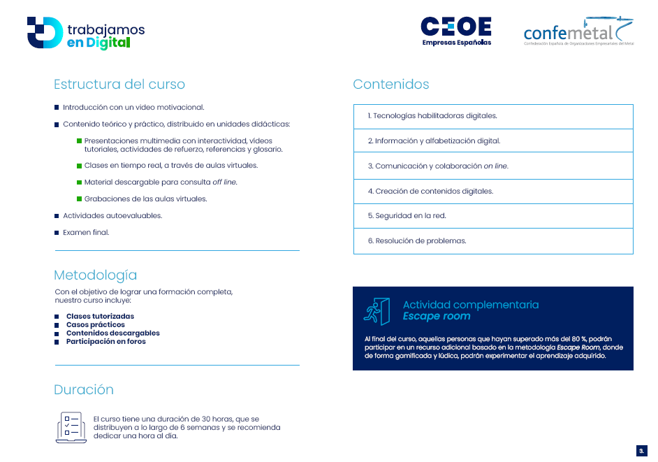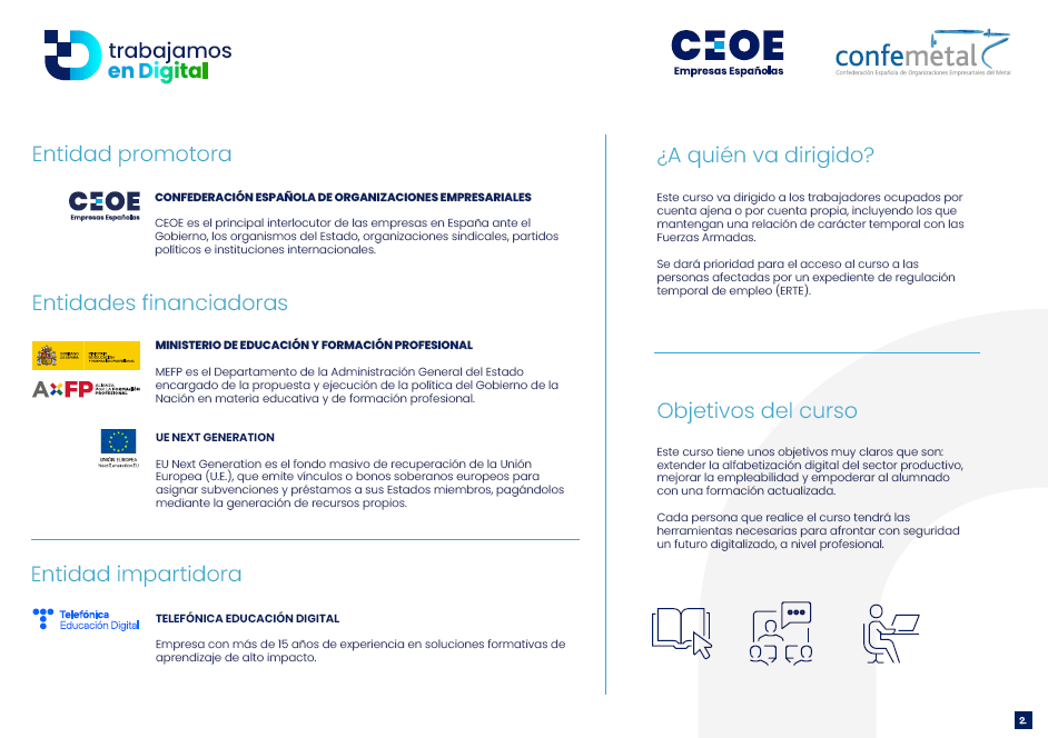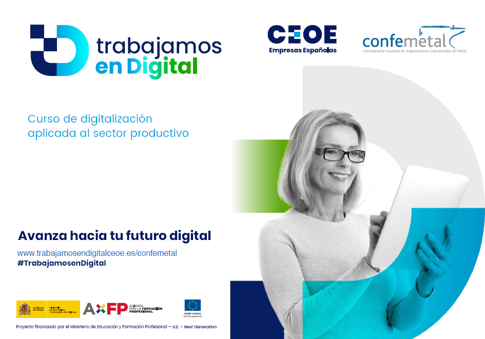 La Confederación Española de Organizaciones Empresariales del Metal (CONFEMETAL) pone a disposición de trabajadores y autónomos la formación virtual tutorizada «Digitalización aplicada al entorno profesional«, que permitirá adquirir competencias digitales adaptadas al sector productivo y puesto de trabajo.