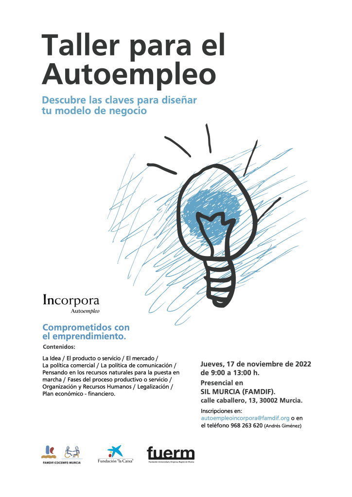 El próximo jueves día 17 de noviembre a las 9:00 horas realizaremos un taller en el que se darán las claves para realizar un plan de negocio. Será en el Servicio de Integración Laboral (SIL) de FAMDIF en la calle Caballero, 13 – bajo 30002 Murcia. Gracias a la colaboración de la ENAE Business School, la Fundación «la Caixa» y el Punto de Autoempleo Incorpora de FAMDIF/COCEMFE-Murcia.