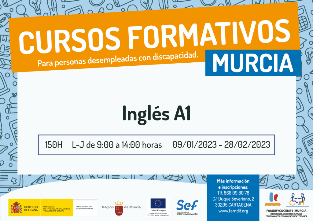 El programa “CONSTRUYENDO UN FUTURO LABORAL: INGLÉS A1” instaurado por FAMDIF/COCEMFE-Murcia está orientado a personas en desempleo sin formación académica con el fin de dar acceso a personas con discapacidad a una formación ocupacional.