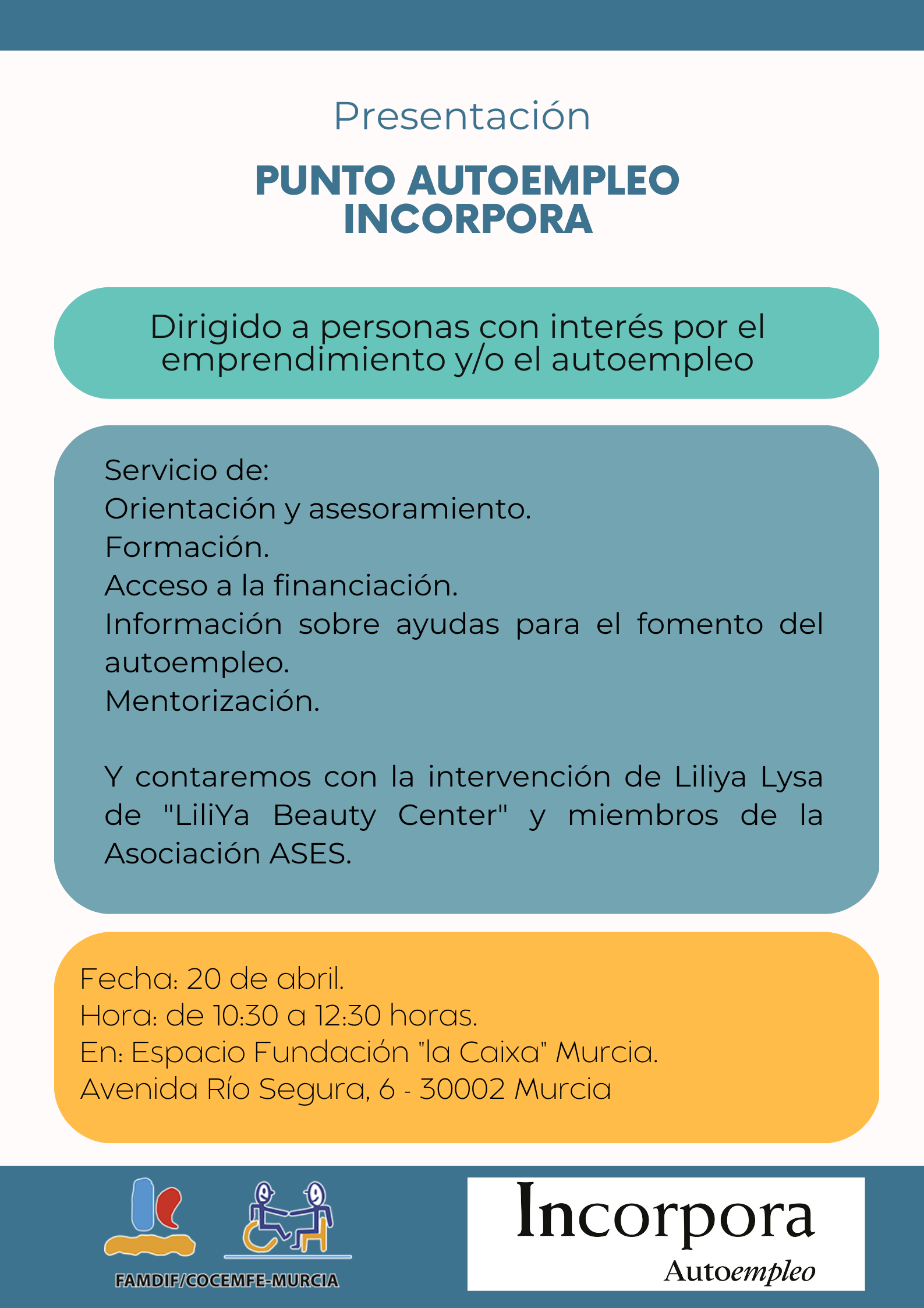 Si estás interesado/a en poner en marcha tu idea de negocio, el próximo jueves en el Espacio de Fundación «la Caixa» Murcia, presentamos nuestro servicio de autoempleo desde el que podremos ayudarte.
