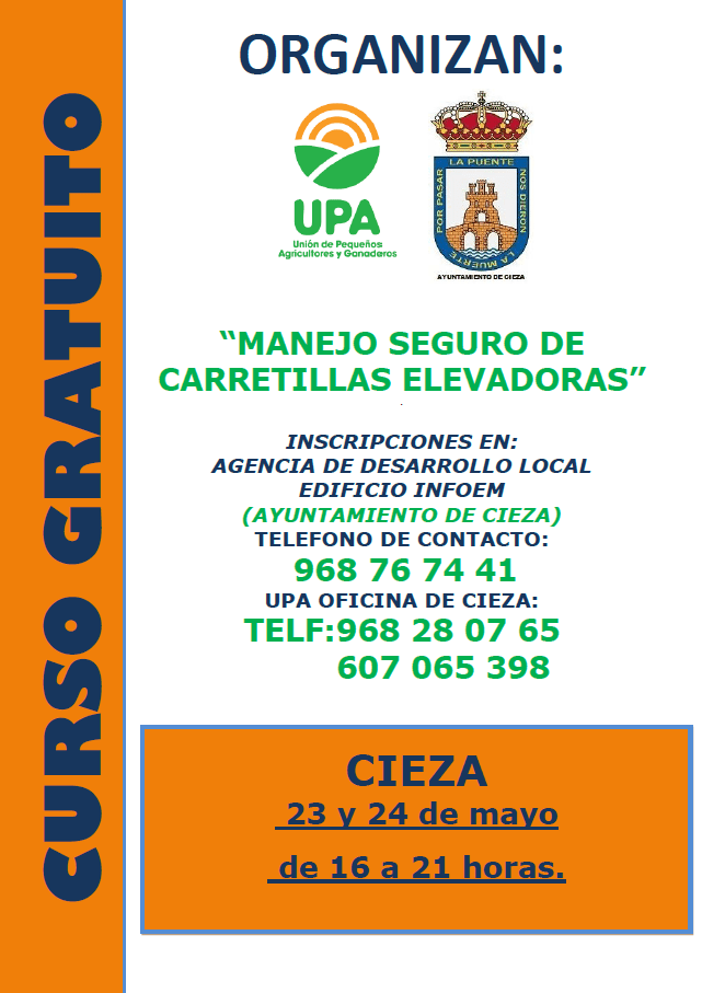 El martes 23 y miércoles 24 de mayo, de 16h a 21h, UPA Murcia te espera en las aulas del Infoem de Cieza en Calle Poligono S, 9.