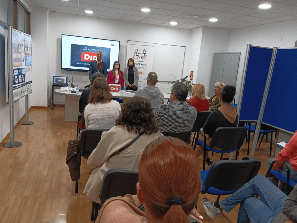 A lo largo del 2023, FAMDIF/COCEMFE-Murcia y Supermercados DÍA (empresa inclusiva) colaboramos en empleo y formación con diversas acciones para favorecer la inserción laboral de las personas con discapacidad física y orgánica. DÍA tiene entre sus fines la inclusión de colectivos en riesgo de exclusión social, y esta colaboración se ha materializado acogiendo a alumnos/as en prácticas no laborales en sus tiendas y en contrataciones, 4 personas con discapacidad física en la Región de Murcia están trabajando en sus tiendas.