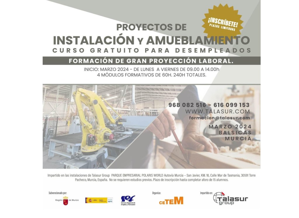 Se trata de una oportunidad de formación en Balsicas en un esfuerzo conjunto por impulsar el desarrollo profesional y brindar nuevas oportunidades laborales. Talasur Group Carpintería de Madera se une al Servicio Regional de Empleo y Formación (SEF) de Torrepacheco, para ofrecer un Curso Gratuito dirigido a desempleados. Empieza en MARZO y son plazas limitadas.