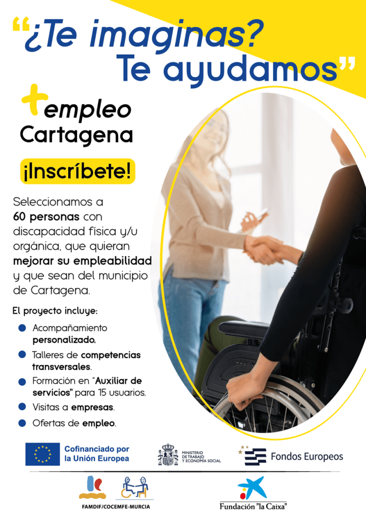 Ya están abiertas las inscripciones para el proyecto + EMPLEO CARTAGENA, una iniciativa de FAMDIF/COCEMFE-MURCIA financiada por Fundación “la Caixa”, y dirigida a personas con discapacidad física y/u orgánica, que se encuentren en búsqueda activa de empleo y sean residentes en el municipio de Cartagena.