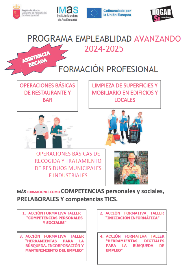 En HOGAR SÍ MURCIA, queremos presentarles nuestra nueva edición del PROGRAMA DE EMPLEABILIDAD AVANZANDO 2024-25. 💼💫 Este programa, financiado por el Fondo Social Europeo Plus y el Instituto Murciano de Acción Social, está dedicado a mejorar la empleabilidad de personas sin hogar. Sabemos que enfrentar el sinhogarismo es una lucha diaria, y estamos aquí para ayudar. 💪💕