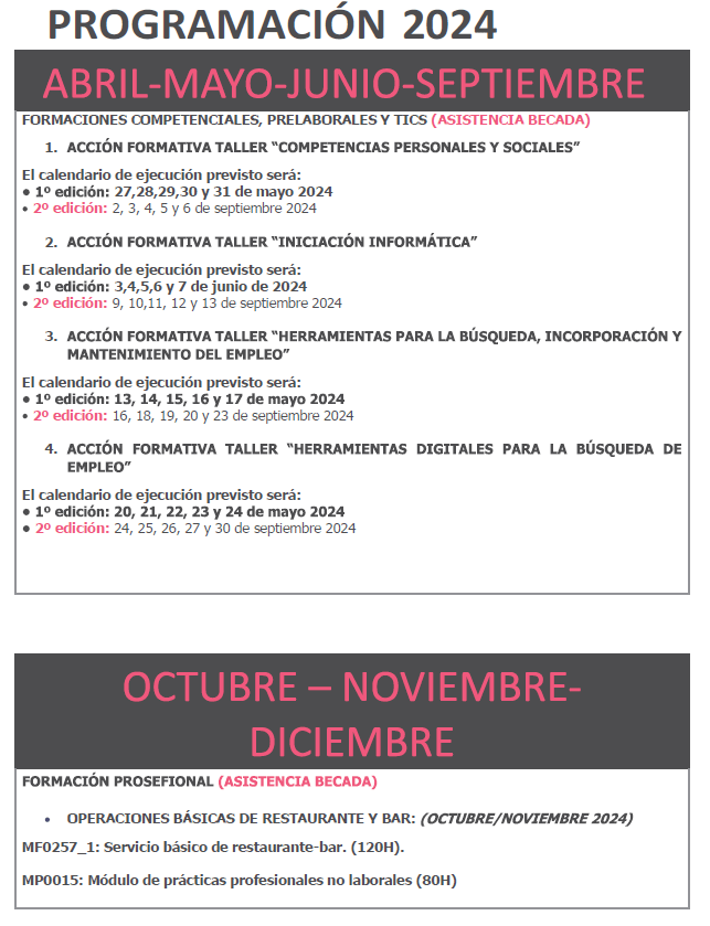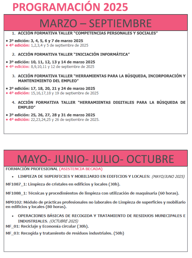 En esta nueva edición, disponemos de una extensa oferta formativa adaptada a las necesidades tanto de los participantes como de las empresas identificadas. Con este fin, se han diseñado una variedad de acciones formativas, que abarcan desde FORMACIONES COMPETENCIALES personales y sociales, PRELABORALES Y LAS COMPETENCIAS TIC o hasta Formaciones Complementarias y transversales como FORMACIÓN EN IGUALDAD DE GÉNERO Y NO DISCRIMINACIÓN o TALLER DE DERECHOS LABORALES entre otros, además llevaremos a cabo actividades de activación para los participantes como visitas guiada a centros de formación y asistencia a jornadas y foros de empleo y Formación Profesional para el Empleo. 📚✨