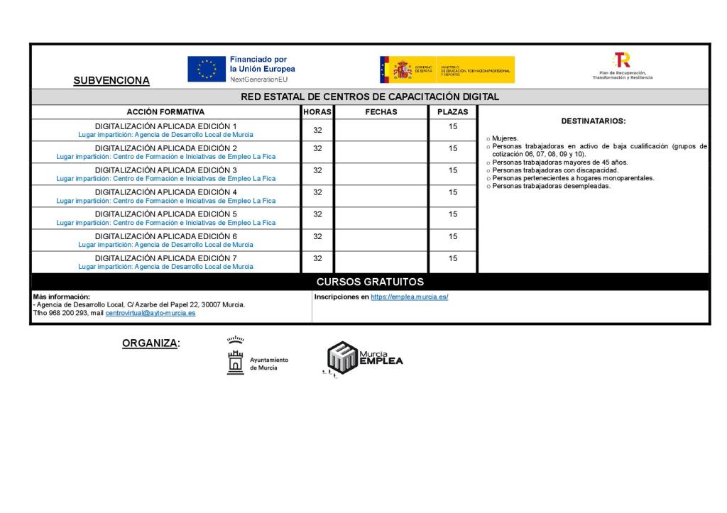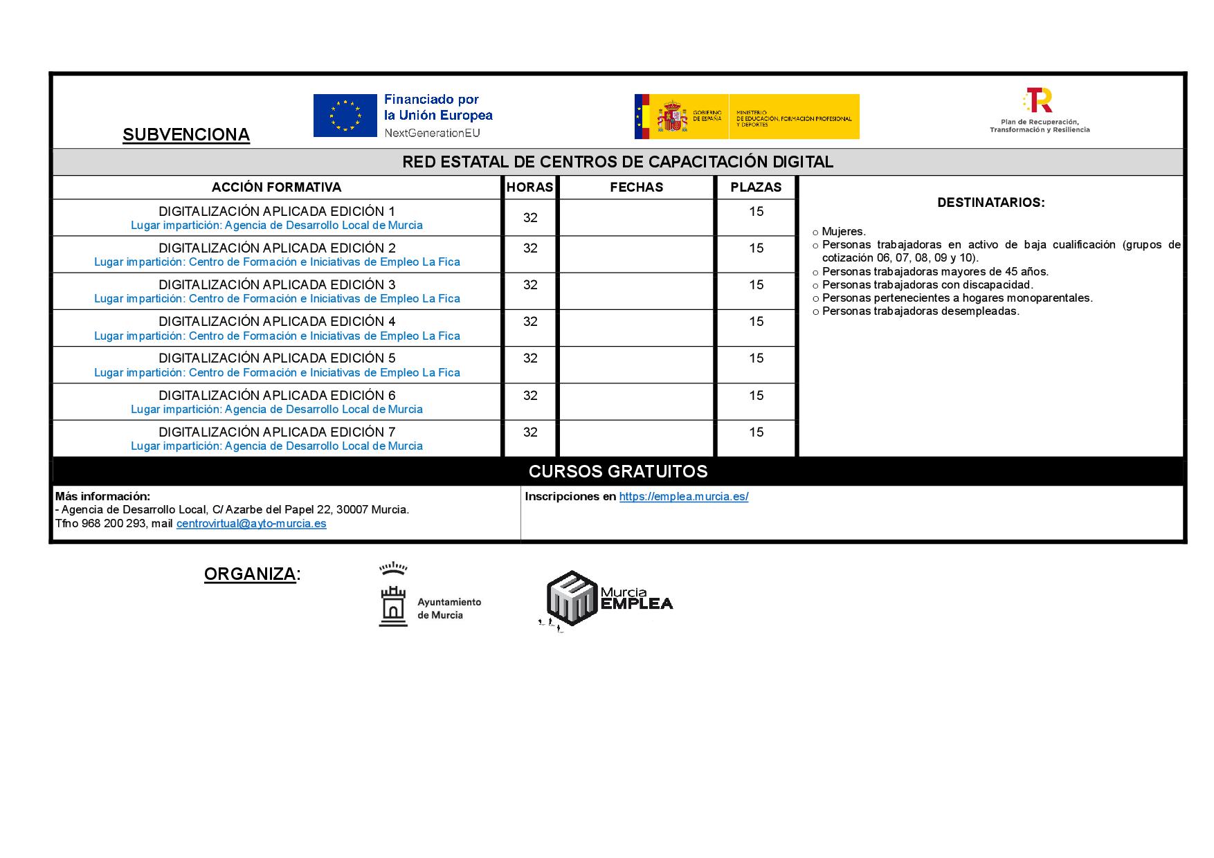El Servicio de Empleo del Ayuntamiento de Murcia ha planificado para el año 2024 varias ediciones de formación en “Capacitación digital” con el objetivo acercar a la ciudadanía la posibilidad de formarse en competencias digitales, ofreciendo oportunidades de formación con independencia del lugar de residencia o formación previa de la misma y facilitando, por tanto, un acceso a la formación compatible con las obligaciones de la ciudadanía derivadas de distintas condiciones personales, laborales o sociales.