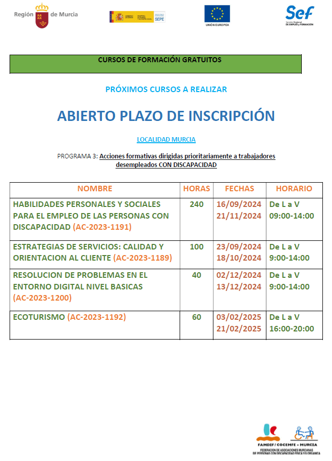 Sin categoría Abierto el plazo de inscripción a 4 acciones formativas ofertadas por FAMDIF en Murcia 24 junio, 202424 junio, 2024 SIL Región de Murcia Descubre más desde SERVICIO DE INTEGRACIÓN LABORAL Suscríbete y recibe las últimas entradas en tu correo electrónico. Escribe tu correo electrónico… Suscribirse Comparte: Haz clic para compartir en X (Se abre en una ventana nueva) X Haz clic para compartir en Facebook (Se abre en una ventana nueva) Facebook Me gusta Cargando... Relacionado Publicado por SIL Región de Murcia Ver todas las entradas de SIL Región de Murcia Comparte: Haz clic para compartir en X (Se abre en una ventana nueva) X Haz clic para compartir en Facebook (Se abre en una ventana nueva) Facebook Me gusta Cargando...