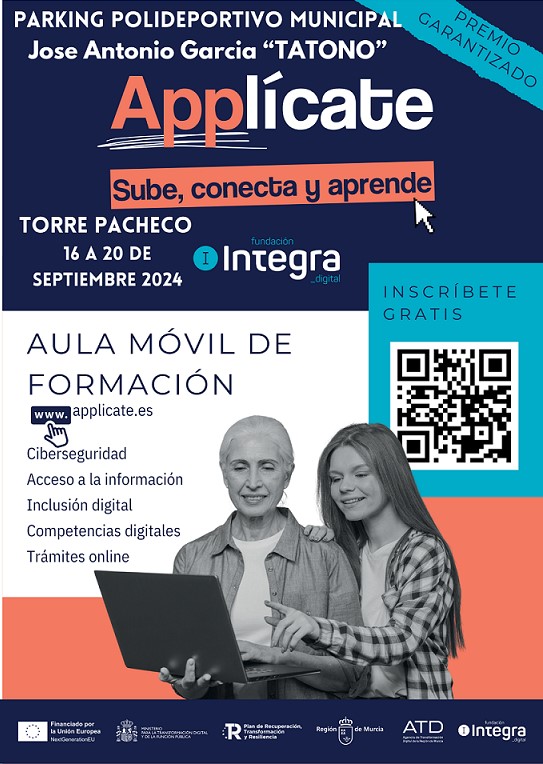 La campaña itinerante «Applícate: sube, conecta y aprende» que ha puesto en marcha la Fundación Integra Digital y el gobierno de la Región de Murcia estará en Torre- Pacheco la próxima semana: un aula móvil estará ubicada desde el lunes a viernes en el parking junto a la entrada en Avda de Roldán del Polideportivo Municipal Jose Antonio Garcia «Tatono» y ofrecerá itinerarios formativos para acercar competencias digitales a la población en general: