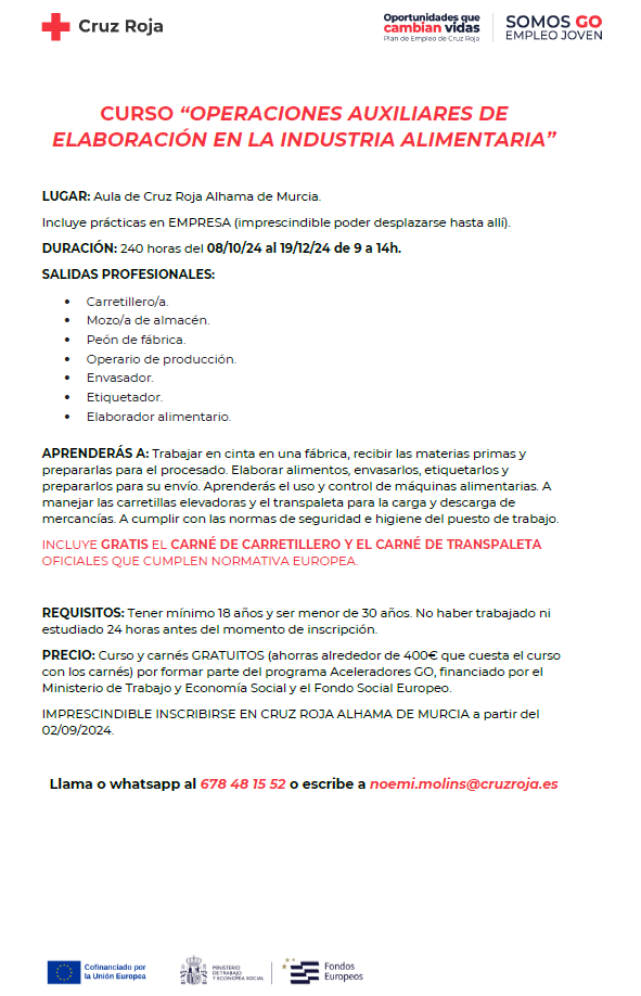 Sin categoría Curso “Operaciones auxiliares de elaboración en la industria alimentaria” 1 octubre, 2024 SIL Región de Murcia Descubre más desde SERVICIO DE INTEGRACIÓN LABORAL Suscríbete y recibe las últimas entradas en tu correo electrónico. Escribe tu correo electrónico… Suscribirse Comparte: Haz clic para compartir en X (Se abre en una ventana nueva) X Haz clic para compartir en Facebook (Se abre en una ventana nueva) Facebook Me gusta Cargando... Relacionado Publicado por SIL Región de Murcia Ver todas las entradas de SIL Región de Murcia Comparte: Haz clic para compartir en X (Se abre en una ventana nueva) X Haz clic para compartir en Facebook (Se abre en una ventana nueva) Facebook Me gusta Cargando...