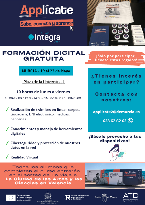 Es una propuesta gratuita, que consiste en la impartición presencial de cursos de formación digital que se desarrollan en diferentes aulas móviles que estarán de forma itinerante en los municipios de toda la región de Murcia.