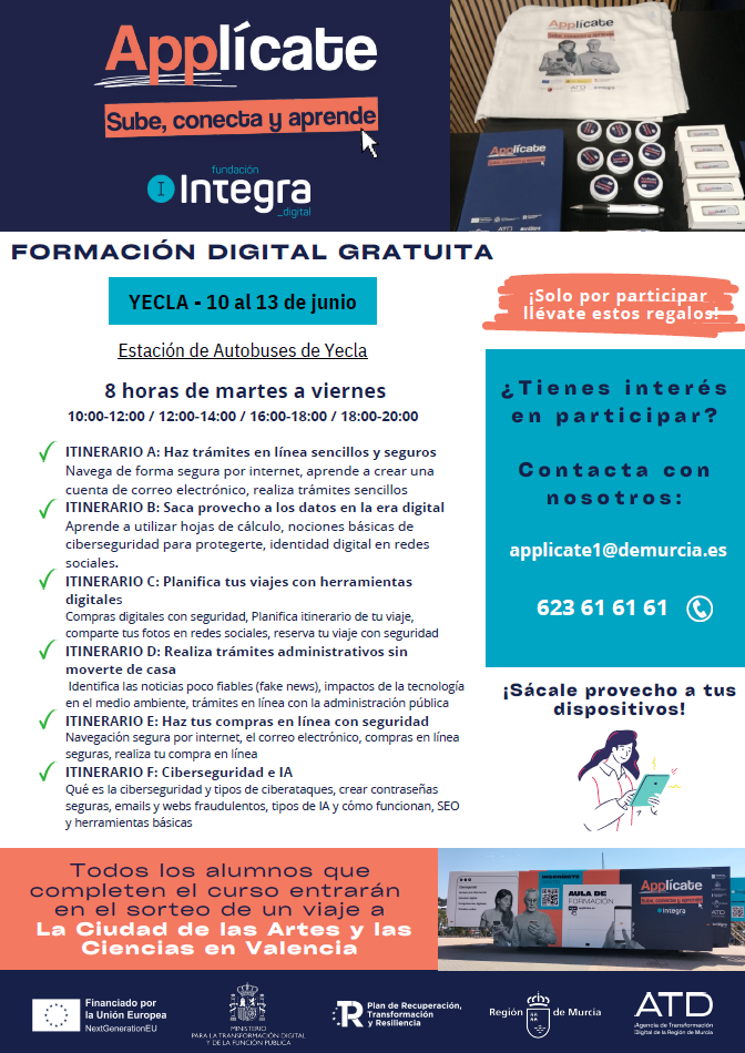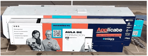 Es una propuesta gratuita, que consiste en la impartición presencial de cursos de formación digital que se desarrollan en diferentes aulas móviles que estarán de forma itinerante en los municipios de toda la región de Murcia.