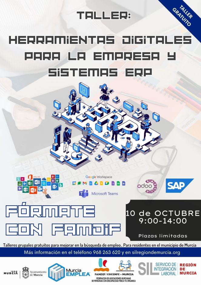 En este taller encontrarás formación básica práctica para iniciarte en el uso de herramientas digitales clave como Google Workspace, Microsoft Teams y otras plataformas colaborativas. Además, conocerás los fundamentos de los sistemas ERP y cómo se aplican en el entorno empresarial actual.