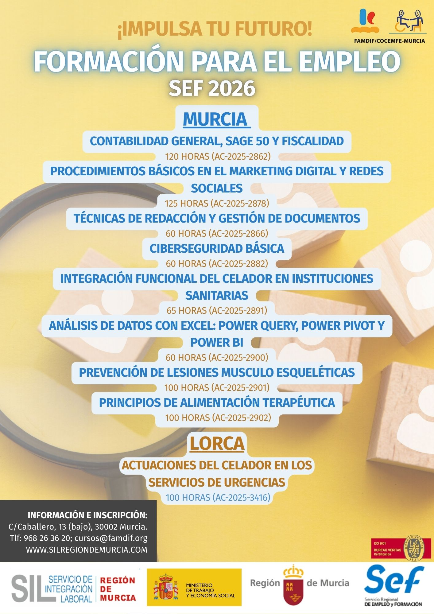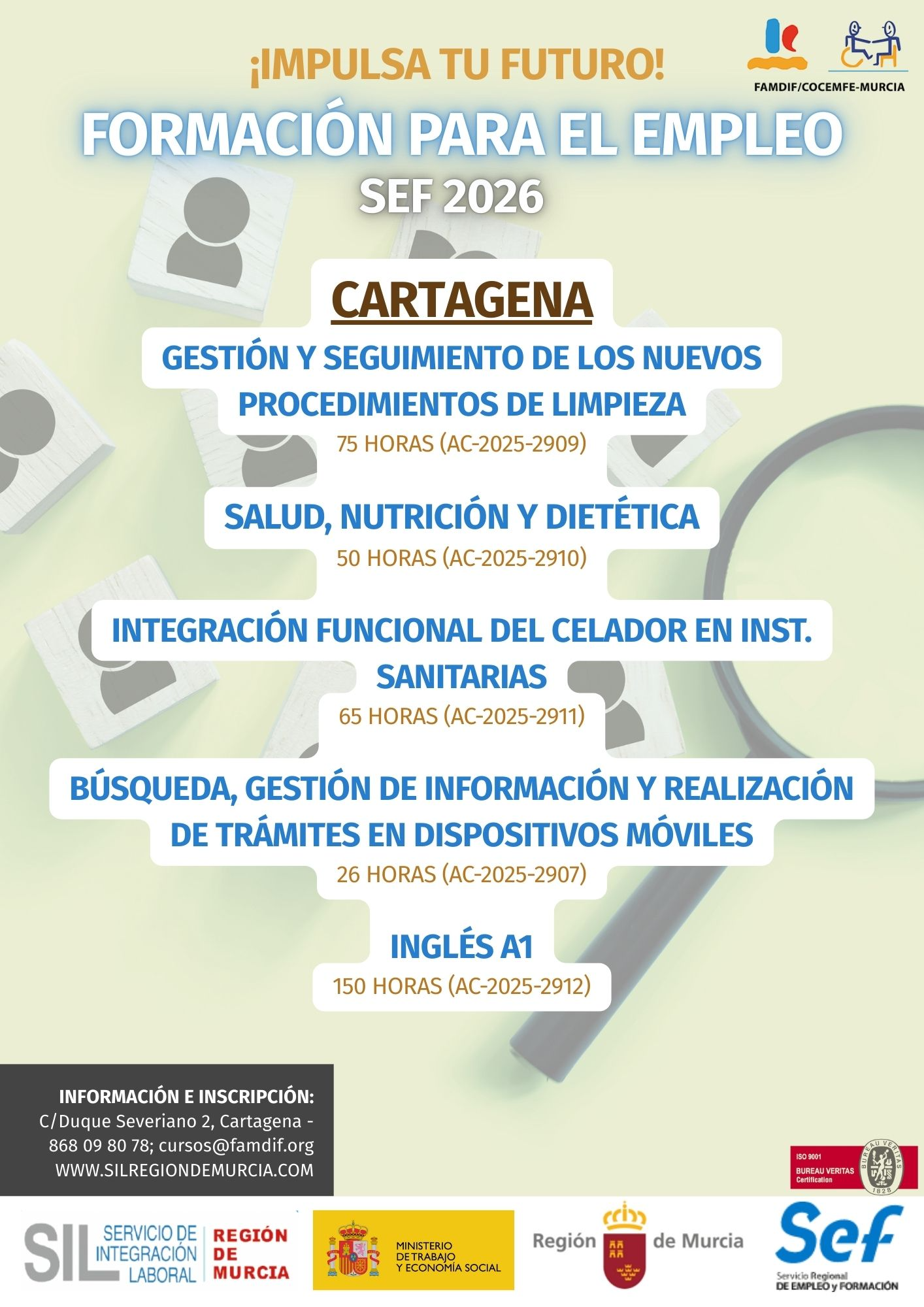 FAMDIF presenta su nueva oferta formativa dirigida a personas desempleadas con discapacidad, una propuesta diseñada para reforzar competencias profesionales y facilitar el acceso al empleo mediante cursos prácticos y acompañamiento personalizado. Si buscas una oportunidad real para mejorar tu perfil y abrir nuevas puertas laborales, este es el momento. Las plazas son limitadas, así que te animamos a inscribirte y dar el primer paso hacia tu próximo objetivo profesional con el apoyo del equipo de FAMDIF.