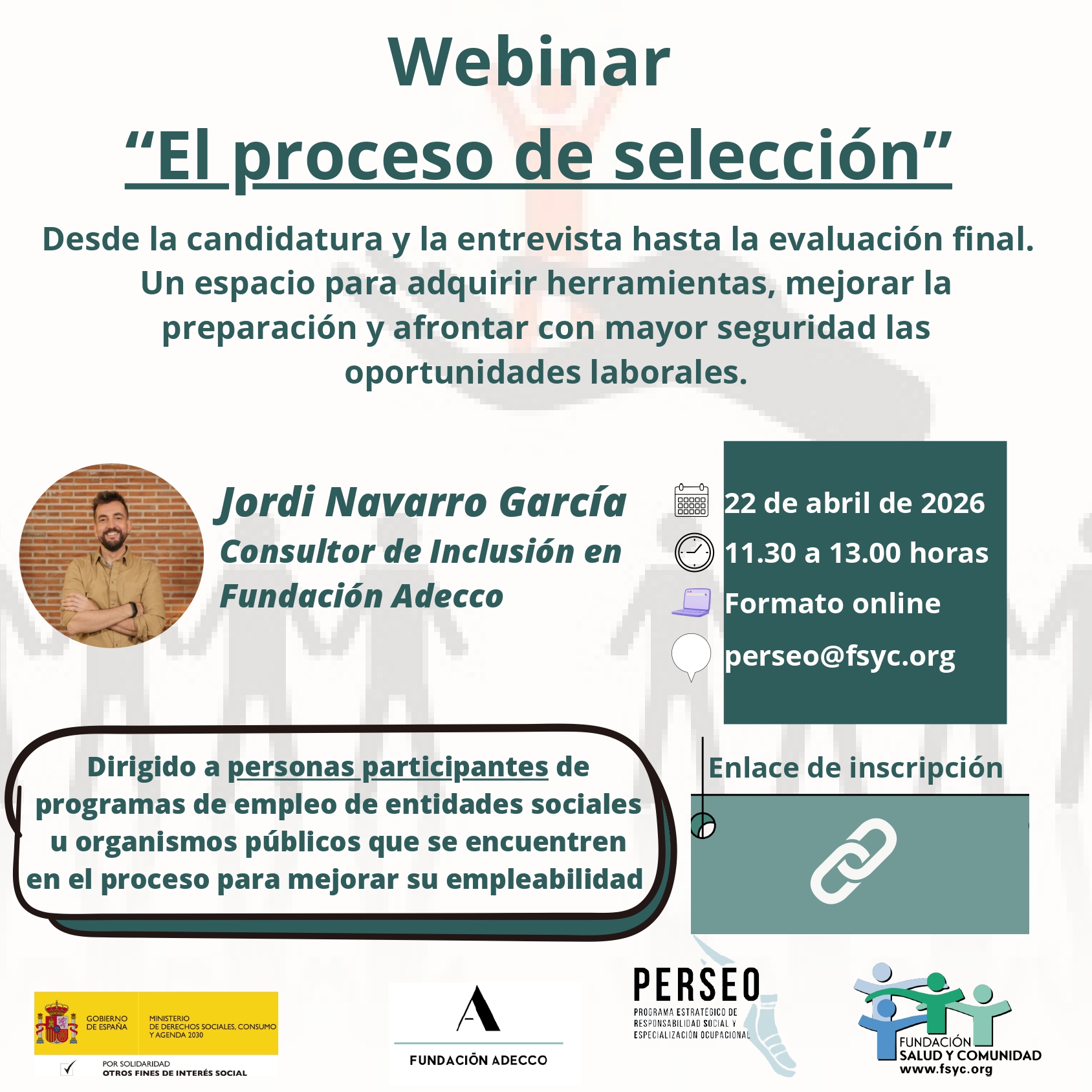 Sin categoría Webinar“El proceso de selección” 13 abril, 202613 abril, 2026 SIL Región de Murcia Descubre más desde SERVICIO DE INTEGRACIÓN LABORAL Suscríbete y recibe las últimas entradas en tu correo electrónico. Escribe tu correo electrónico… Suscribirse Comparte: Compartir en X (Se abre en una ventana nueva) X Comparte en Facebook (Se abre en una ventana nueva) Facebook Me gusta Cargando... Relacionado Publicado por SIL Región de Murcia Ver todas las entradas de SIL Región de Murcia Comparte: Compartir en X (Se abre en una ventana nueva) X Comparte en Facebook (Se abre en una ventana nueva) Facebook Me gusta Cargando...