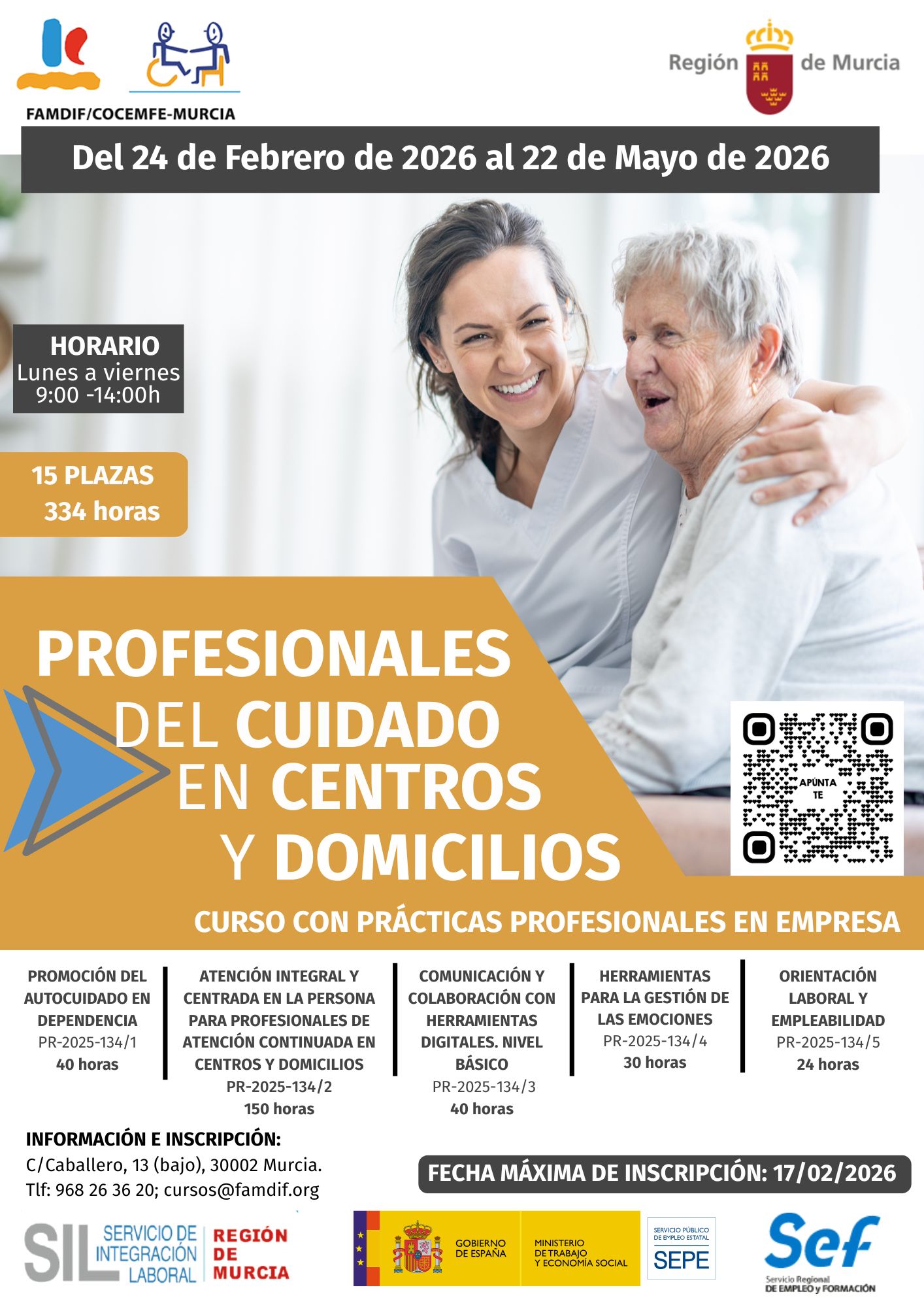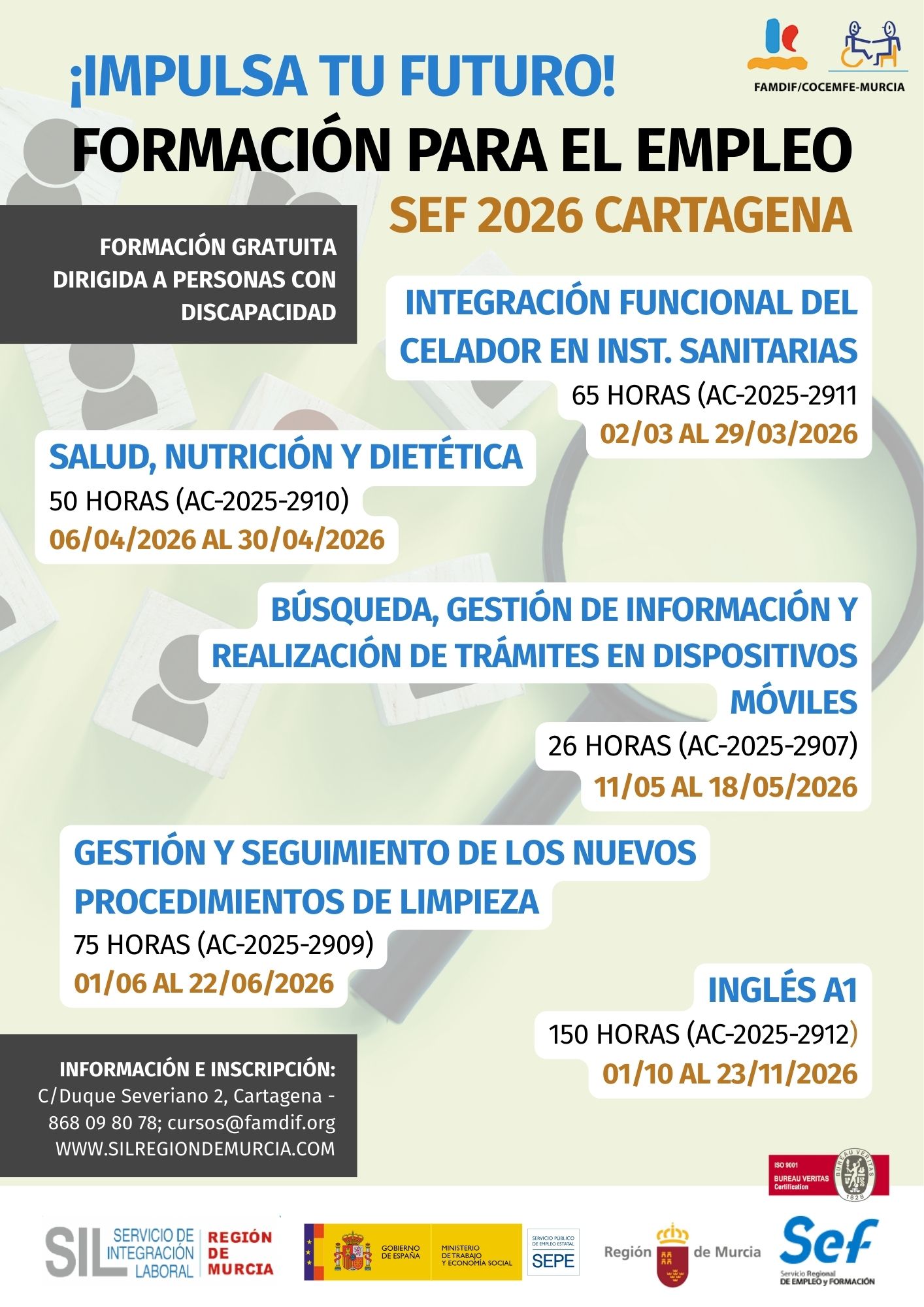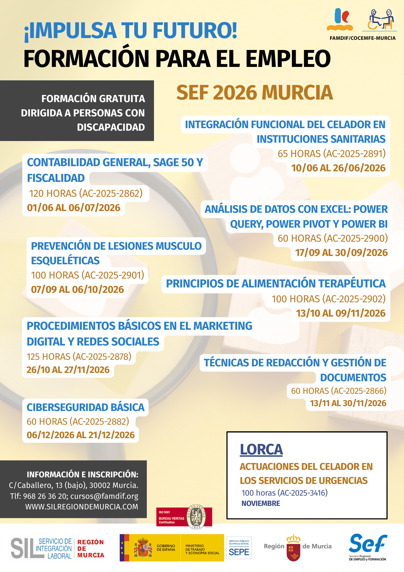 Inscríbete para obtener información aquí o contacta con el servicio de formación en cursos@famdif.org o en el teléfono 968 263 620.