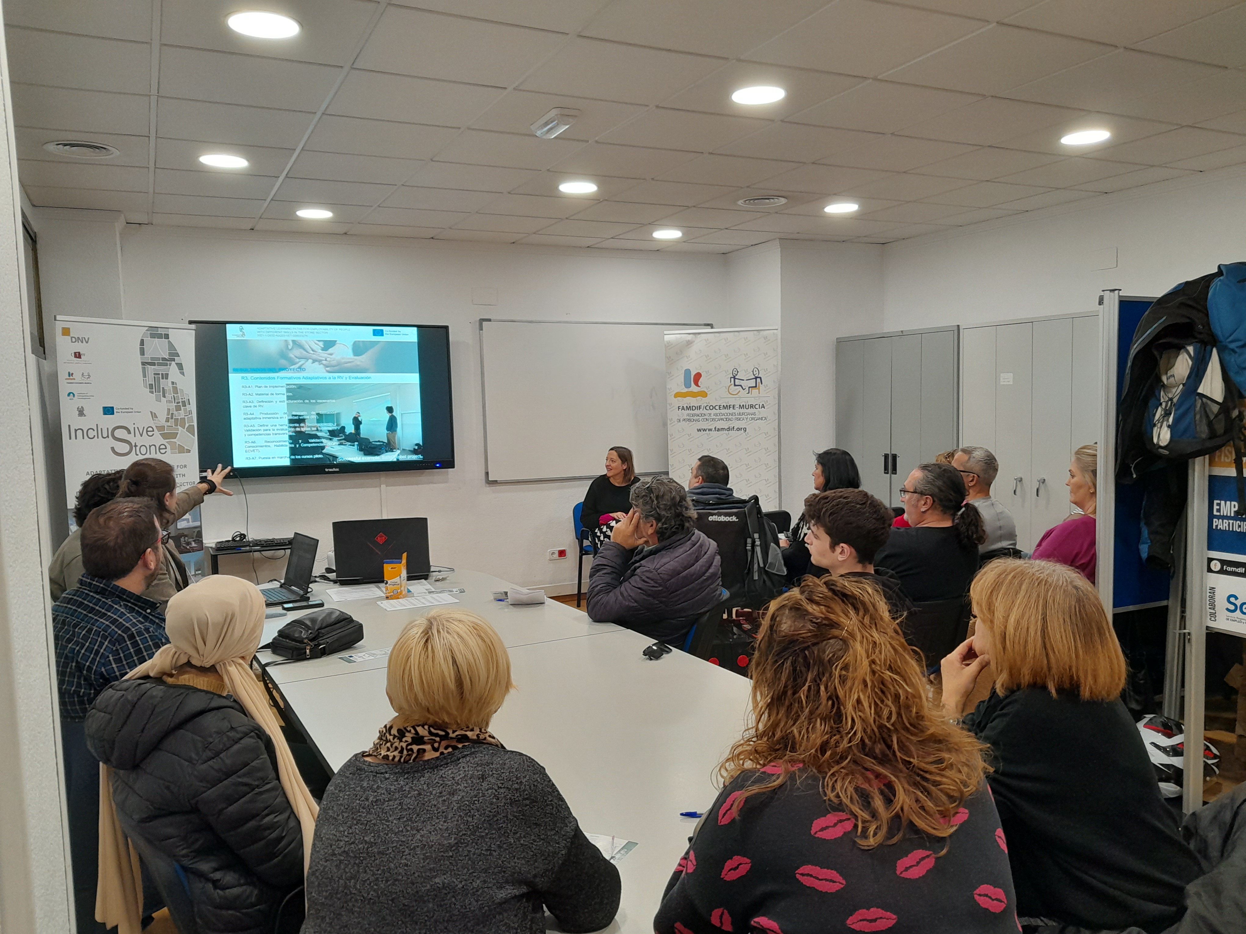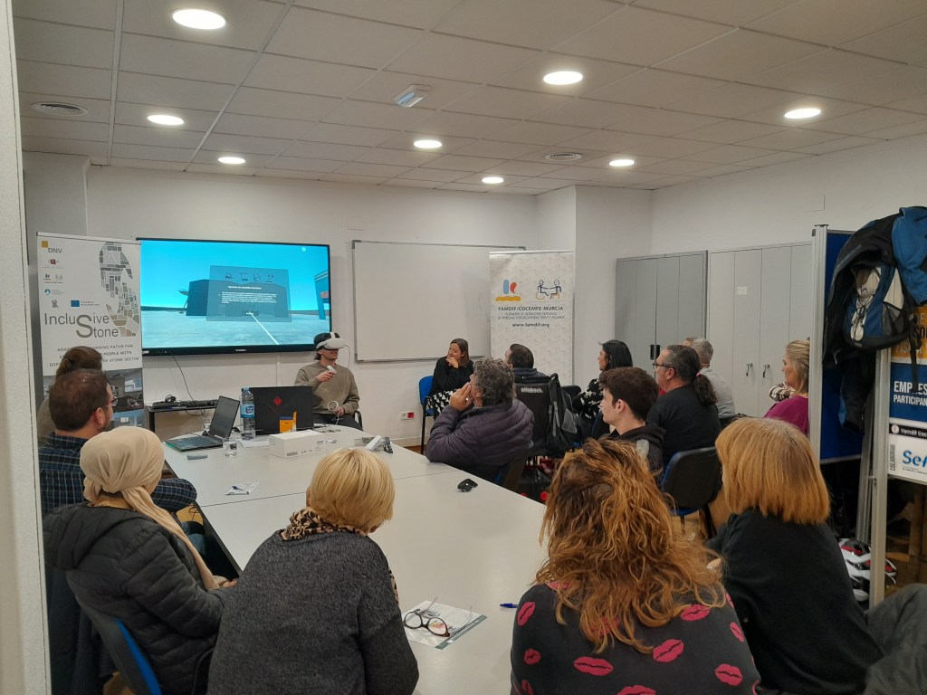 El día 14 de diciembre 2023 tuvo lugar en las instalaciones del Servicio de Integración Laboral de FAMDIF/COCEMFE Murcia, el encuentro PILOT del proyecto europeo «Inclusive Stone». Asistieron, en dos grupos, 41 personas con discapacidad que tuvieron la oportunidad de conocer más a fondo el contenido y el objetivo del proyecto, además de usar con sus propias manos la herramienta de realidad virtual utilizada. De hecho, varios/as de ellos/as se ilusionaron probando las gafas de realidad virtual que les han permitido vivir la experiencia que viven a diario los trabajadores de una fábrica tales como conducir una grúa torre o una carretilla elevadora.
